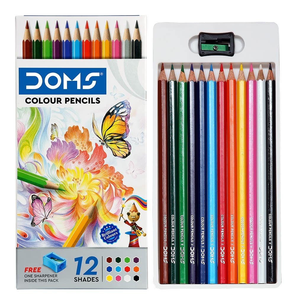 “DOMS Colour Pencils 12 shades flat tin is the most preferred colouring tool used by Sharp Minds to create a rich and luminous depth to their paintings. Available in 12 assorted colors, these pencils are waxy and full of bright pigment. Perfect for blending and experimenting different art strokes.